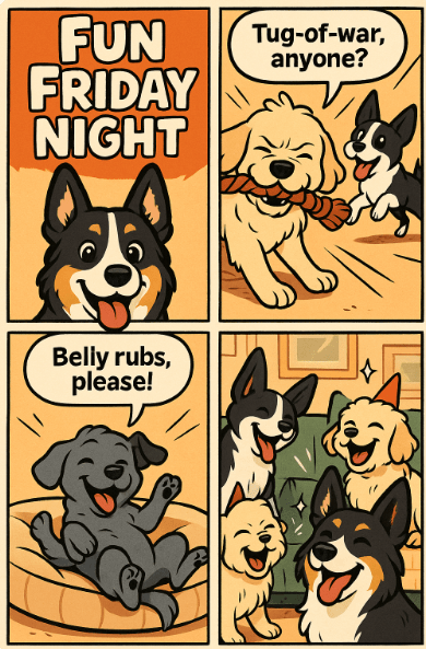 😂 “When the squad says ‘just one movie’ but it turns into tug-of-war, belly rub requests, and chaos.”